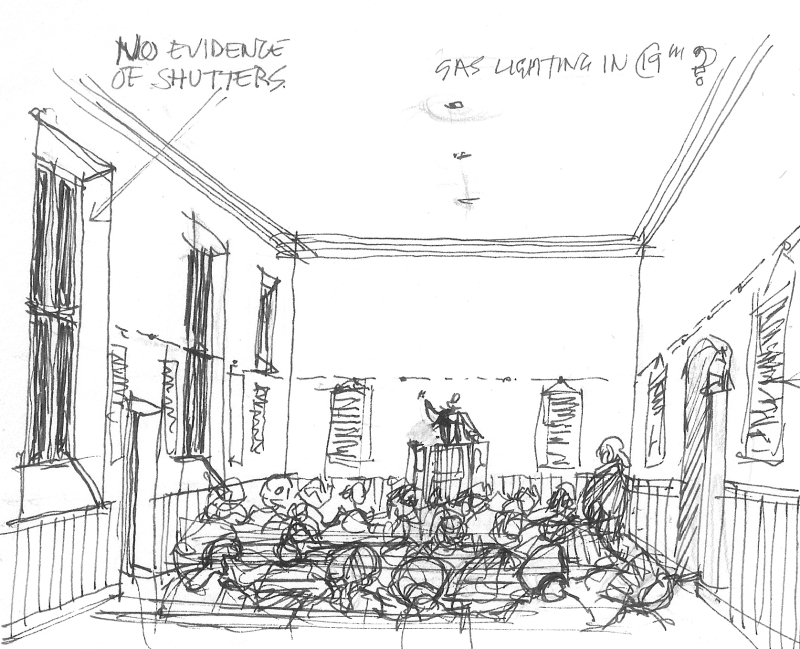 The sketch below is by UEHS member Ken Martin. It shows the interior of the chapel as it probably appeared in the 18th century. He notes that gas lighting was probably not installed till the 19th century.
